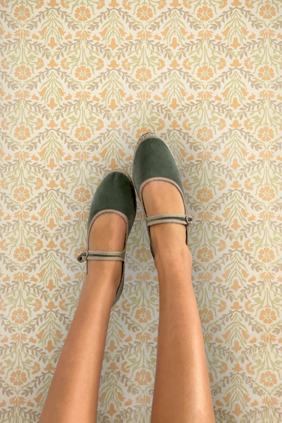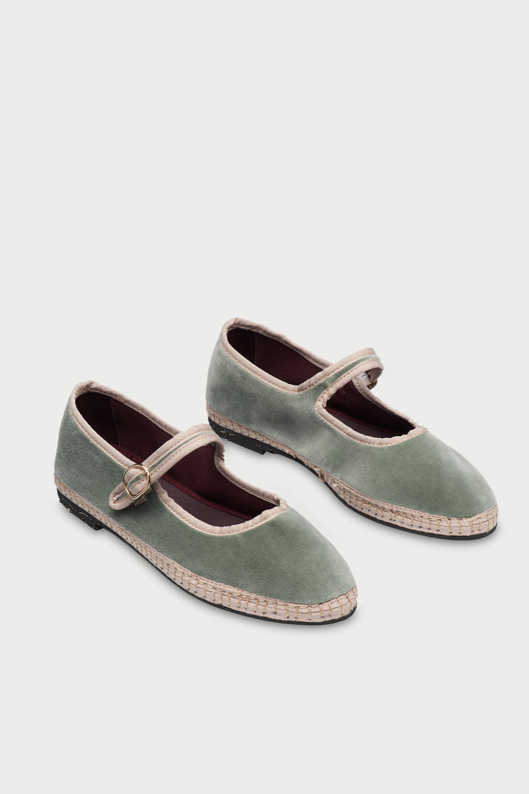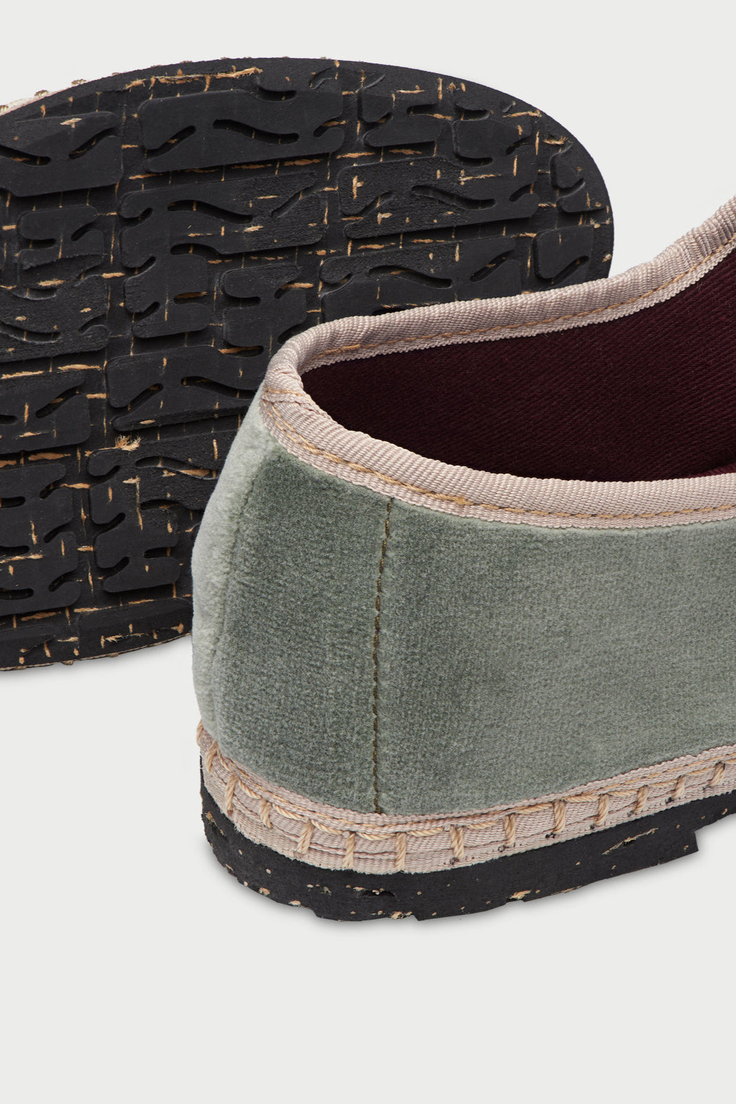 The Uta is a velvet Mary Jane in a soft military green, accented with beige piping and secured by a buckle closure. Its exterior features 100% cotton velvet, while the interior consists of breathable organic cotton lining and a 100% breathable, antibacterial fabric insole. The rubber sole is crafted from recycled bicycle tires. Inspired by the fusion of Spanish espadrilles and Italian Venetian friulane, this shoe combines durability, timeless style, and versatility, offering today’s woman comfort and resilience for any occasion. We recommend ordering a half size up.