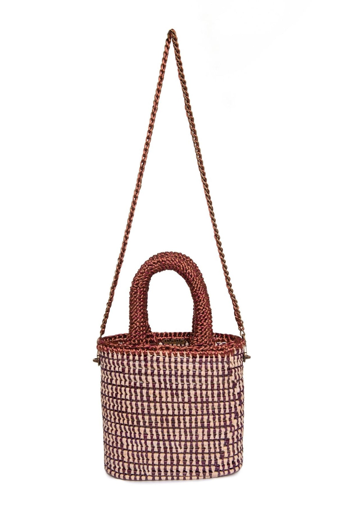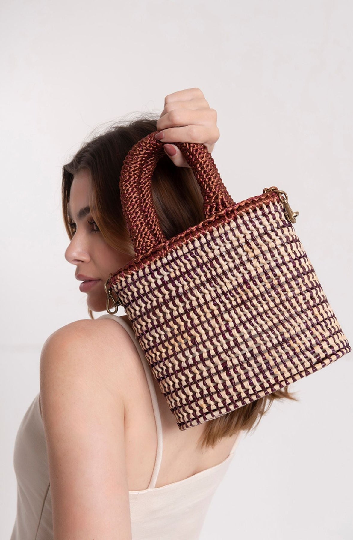 The Vida bag is a structured statement piece, handcrafted from carnauba straw using the intricate trancado technique and a refined two-tone color blend. It features a soft fabric lining and a unique crochet handle that adds an artisanal touch. Designed for versatility, it can be carried by hand or worn with the detachable Italian-finished metal strap for an elegant, modern look. Each piece takes up to four days to complete, honoring the time and essence of true artisanal craftsmanship.